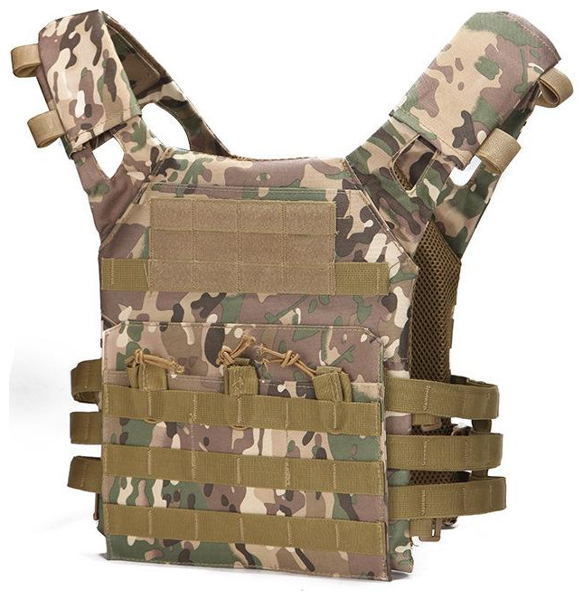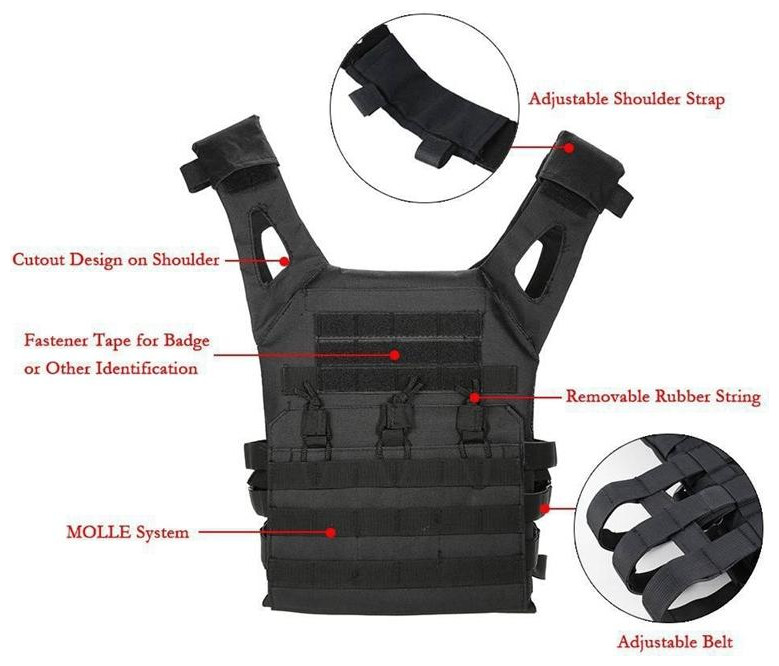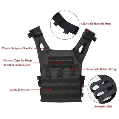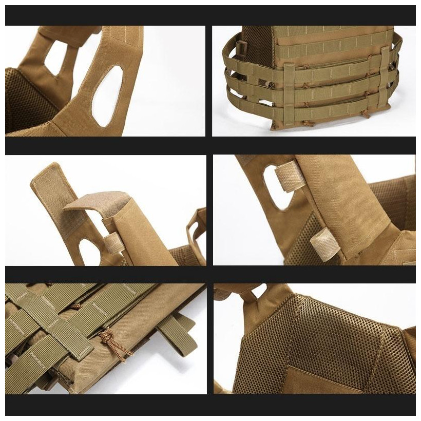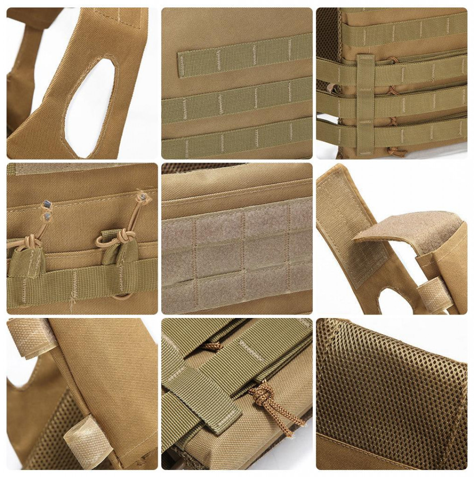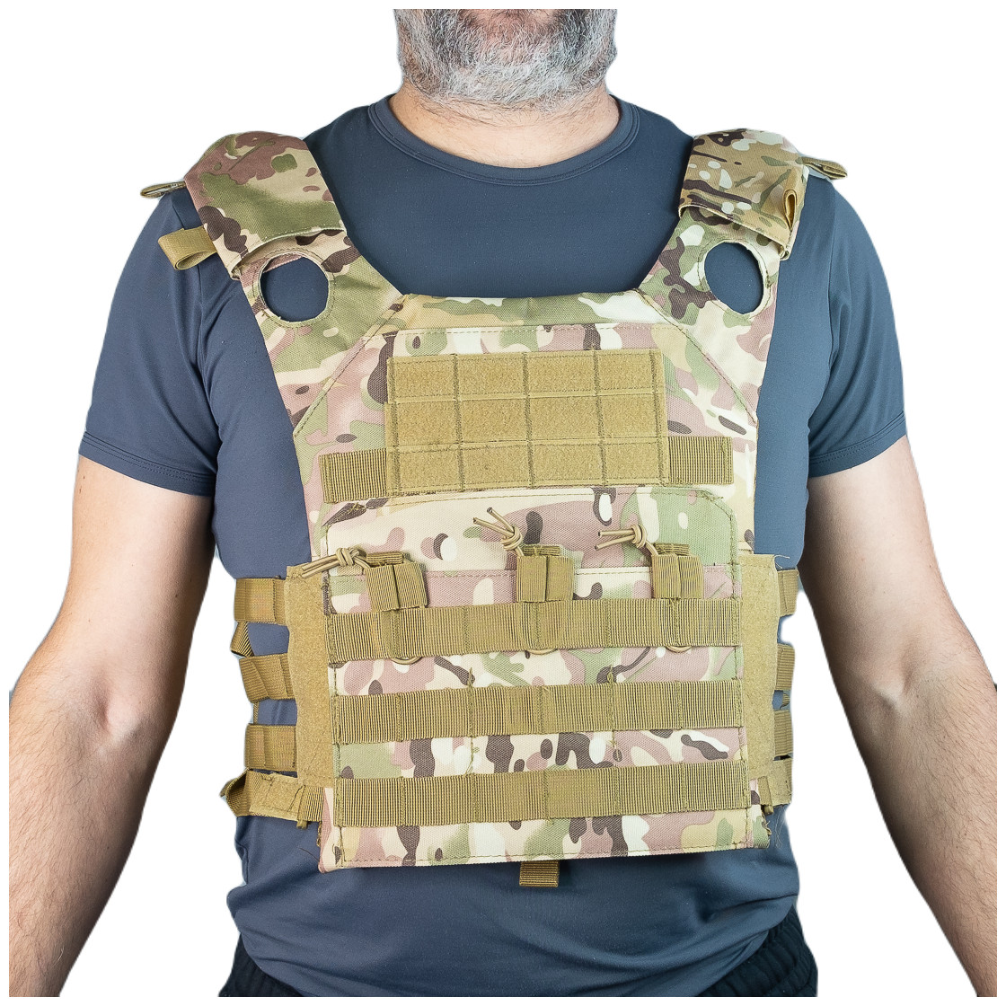 Γιλέκο μάχης νέας γενιάς από την εταιρεία MiJo, μεταφοράς αλεξίσφαιρων πλακών, το απαραίτητο αξεσουάρ για την άρτια οργάνωση του εξοπλισμού σας, κατασκευασμένο από 100% Polyester, που προσφέρει μεγαλύτερη αντοχή και διάρκεια στον χρόνο, εξοπλισμένο με σύστημα τύπου MOLLE επιτρέπει τη γρήγορη και εύκολη τοποθέτηση οποιονδήποτε θηκών γεμιστήρων, φορέων υδροδοχείου, θήκες πιστολιού, κτλ., δίνοντας ελευθερία κινήσεων στον χρήστη. Το γιλέκο προσαρμόζεται πανεύκολα και αφαιρείται γρήγορα με απλή ανασήκωση του μπροστινού τμήματος. Το απόλυτο army vest σε tactical εξοπλισμό!
