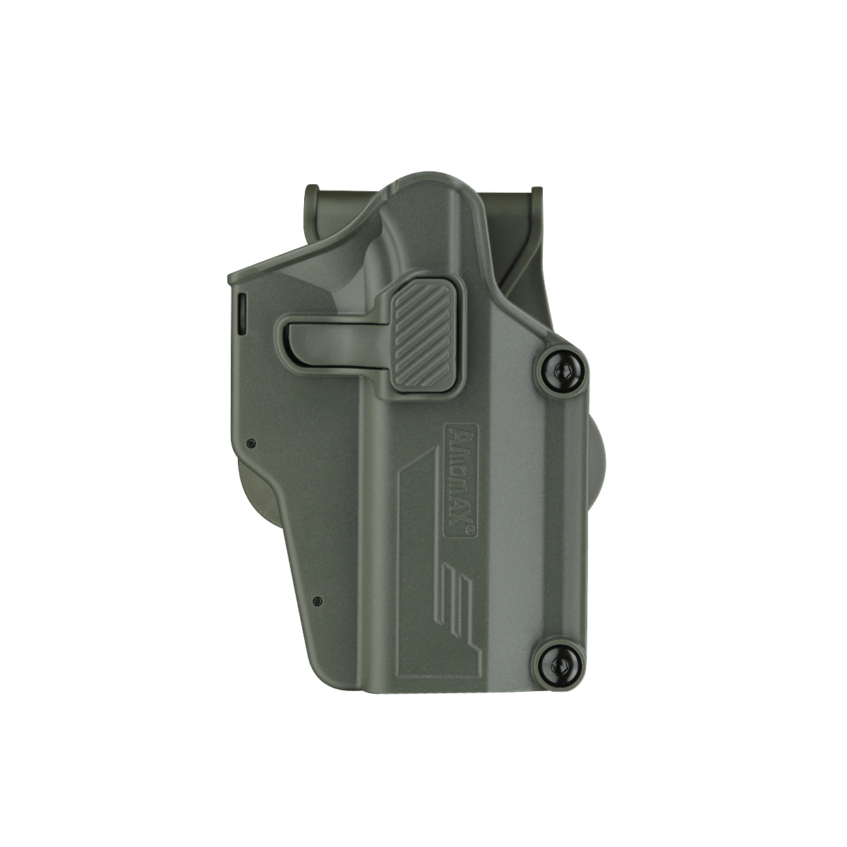 Θήκη Πιστολιού Amomax Per-Fit Universal συμβατή με περισσότερα από 80 airsoft ή πραγματικά πιστόλια, όπως Glock, Sig Sauer, CZ, Ruger, Springfield Armory, Beretta, Smith & Wesson, σειρά 1911 κ.λπ. Η κλασική απελευθέρωση με το δάχτυλο παρέχει ασφαλή συγκράτηση. Γραμμωτό φινίρισμα έχει προστεθεί στο κουμπί απελευθέρωσης, παρέχοντας πολύ καλή, επιχειρησιακή αίσθηση. Με 3 εύκολα βήματα ρυθμίζετε την θήκη ανάλογα με το μέγεθος του πιστολιού σας. Η θήκη Per-Fit είναι συμβατή με 4 διαφορετικές πλατφόρμες μεταφοράς – κουπί (στάνταρ), κλιπ ζώνης, MOLLE και πλατφόρμα μηρού. Το σώμα της θήκης περιστρέφεται 360 μοίρες. Οι χρήστες μπορούν εύκολα να προσαρμόσουν τη θέση μεταφοράς.
