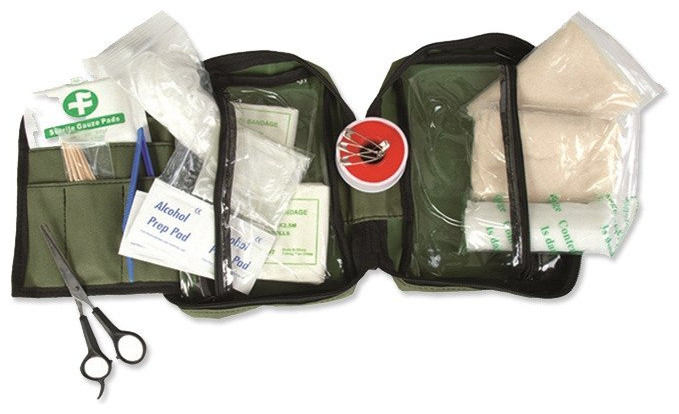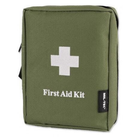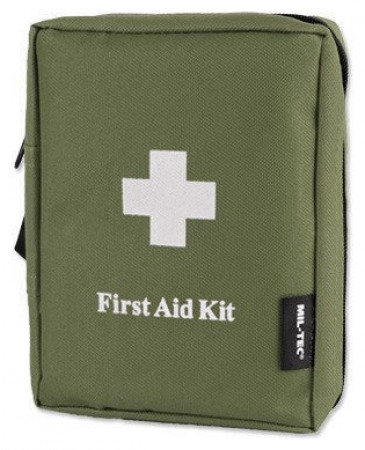 Τσαντάκι πρώτων βοηθειών από την κορυφαία εταιρεία Mil-Tec, απαραίτητο αξεσουάρ για πεζοπορία, κατασκήνωση, κυνήγι, off-road trips αλλά και για μέσα στο σπίτι! Αποτελεί ένα κιτ πρώτων βοηθειών με φερμουάρ και διάφανες θήκες. Είναι εξοπλισμένο με: Ψαλίδι, Μπατονέτες, Τσιμπιδάκι, Παραμάνες, 8 Λευκοπλάστ, 4 Μαντηλάκια οινοπνεύματος, Αυτοκόλλητος επίδεσμος, 2 αποστειρωμένοι επίδεσμοι, Sterile first aid dressing, Ελαστικός επίδεσμος, Μάσκα έκτακτης ανάγκης, 4 αντισηπτικά μαντηλάκια, Γάντια μίας χρήσης, Τριγωνικός επίδεσμος.
