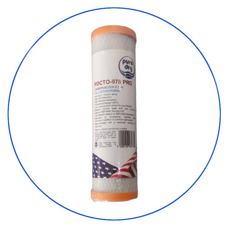 Το φίλτρο συμπαγή ενεργού άνθρακα της Puredry αποτελεί ένα πολυδύναμο φίλτρο, κατασκευασμένο για να προσφέρει προστασία από μια σειρά μολυσματικών παραγόντων του νερού βρύσης, με έμφαση στην αποτελεσματική απομάκρυνση των οργανικών πτητικών ενώσεων, των χημικών καθώς και των κυστών, έως και 0,1 micron. Κατασκευασμένο από υψηλής ποιότητας ενεργό άνθρακα. Επιπλέον, χάρη στο συστατικό μπλοκ άνθρακα που περιέχει απομακρύνει βαρέα μέταλλα όπως μόλυβδο, χαλκό, υδράργυρο, στρόντιο, αρσενικό και κάδμιο. Επιπρόσθετα, απομακρύνει το χλώριο, τα φυτοφάρμακα παρέχοντας εξαιρετική γεύση στο νερό, χάρη στο συστατικό κοκκοφοίνικα που διαθέτει.