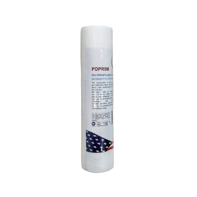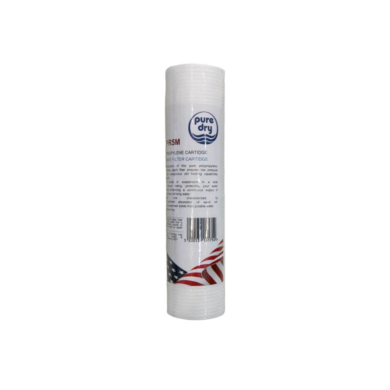 PDPR5M φίλτρο υψηλής ποιότητας στερεών σωματιδίων 10" από ίνες πολυπροπυλενίου της Puredry (USA).Αφαιρεί χώμα, άμμο, λάσπη, σκουριά, ιζήματα, μικροσωματίδια και αιωρούμενα στερεά έως 5 micron. Ιδανικό φίλτρο στερεών για όλα τα συστήματα φίλτρανσης και τις μονάδες αντίστροφης όσμωσης. Προστατέψτε την υδραυλική εγκατάσταση και τις συσκευές σας, τοποθετώντας ένα φίλτρο προλυπροπυλενίου δίπλα στο υδρόμετρο. Με αυτό τον τρόπο προστατεύετε όλη την εγκατάσταση από φθορές σε βρύσες, καζανάκια, καφετιέρες, φλοτέρ κτλ. Η διάρκεια ζωής του κυμαίνεται από 3 έως 12 μήνες, εξαρτάται από την ποιότητα του νερού. θα πρέπει να ελέγχετε σε τακτά χρονικά διαστήματα, γι' αυτό συνήθως τοποθετείται σε διάφανη φιλτροθήκη. Η θερμοκρασία λειτουργίας είναι: 2°C – 80°C.