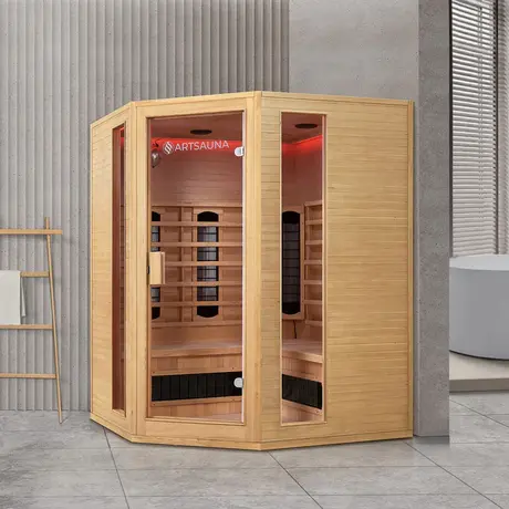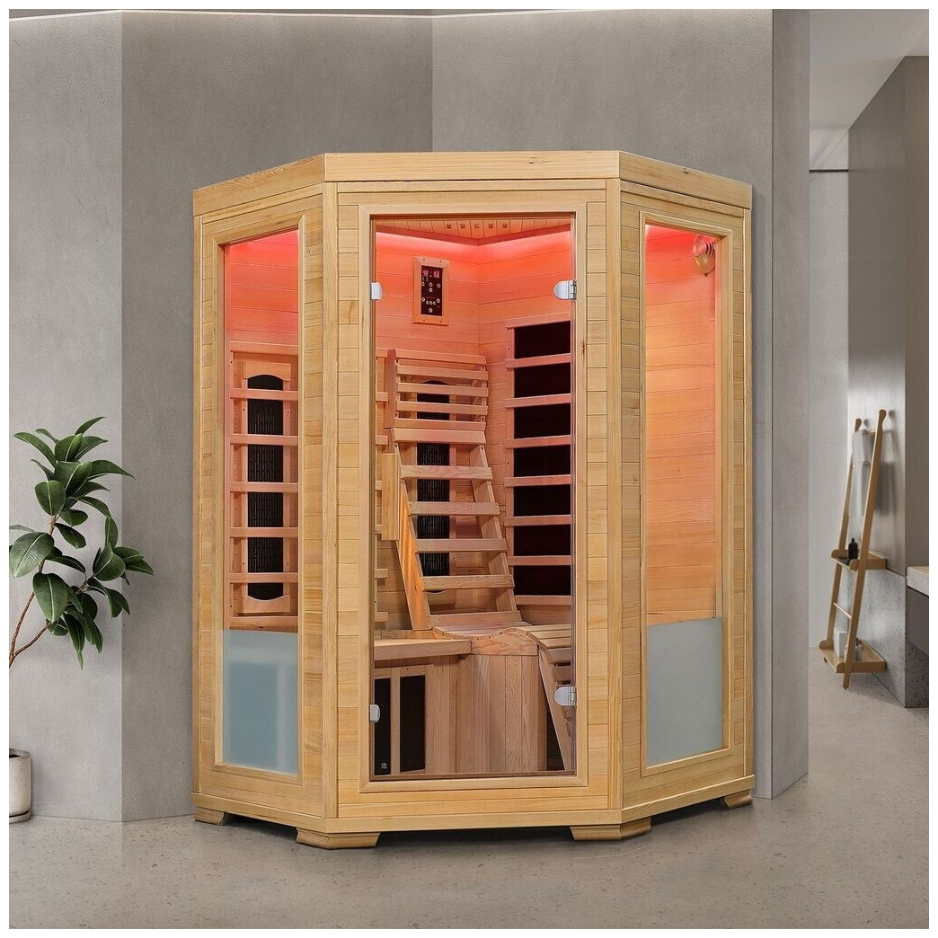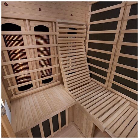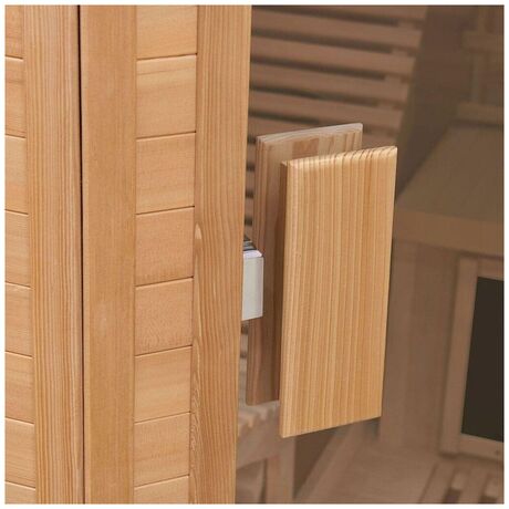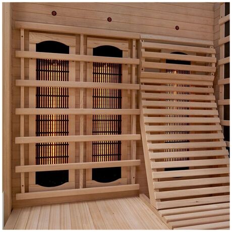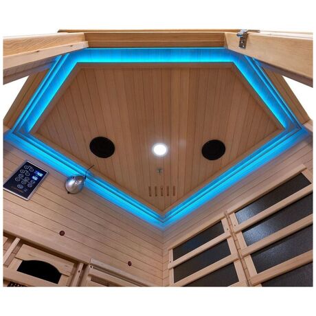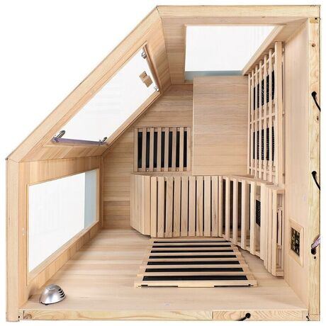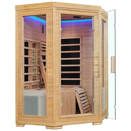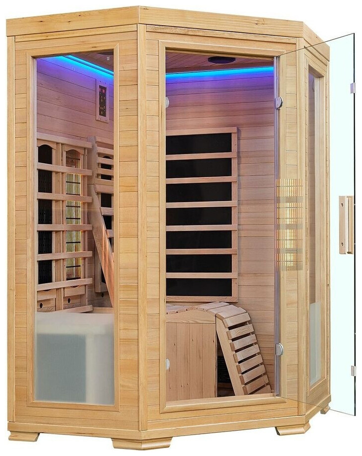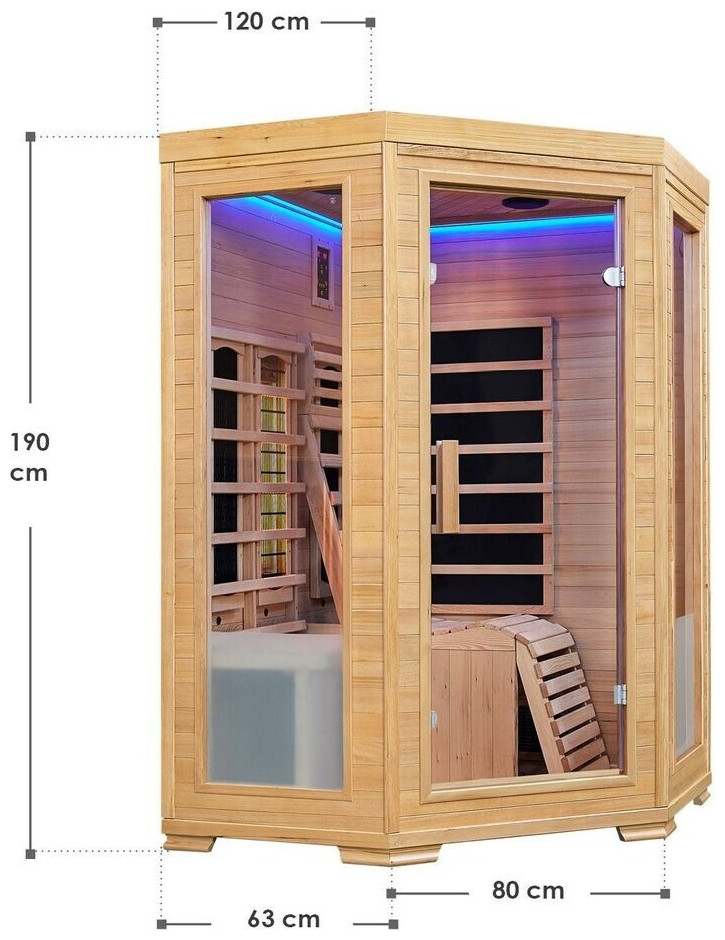 Η σάουνα διαθέτει 4 πλήρους φάσματος θερμαντικά σώματα και 3 επιφανειακά θερμαντικά σώματα, εξασφαλίζοντας ομοιόμορφη κατανομή θερμότητας. Η γυάλινη πόρτα από ασφαλές γυαλί προσφέρει μια μοντέρνα αίσθηση, ενώ η γωνιακή είσοδος διευκολύνει την πρόσβαση. Με φωτεινή ροή 180 lm και θερμοκρασία χρώματος 3000 K, η ατμόσφαιρα είναι πάντα ευχάριστη και χαλαρωτική. Η συναρμολόγηση απαιτείται, αλλά οι οδηγίες είναι απλές και κατανοητές.