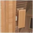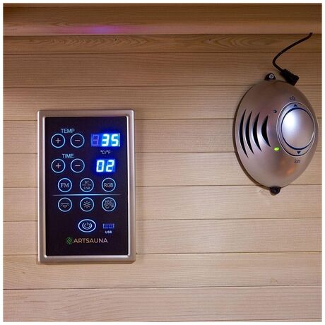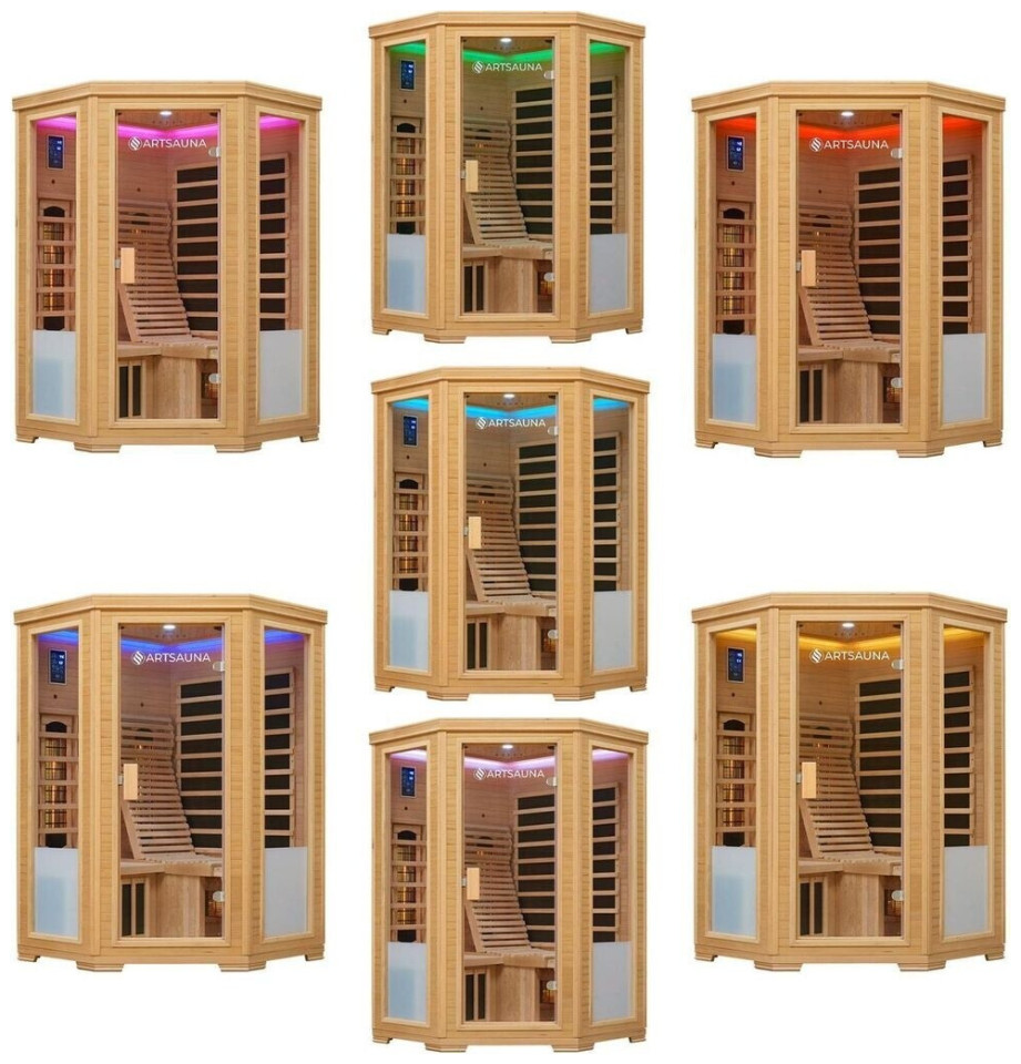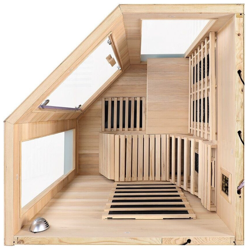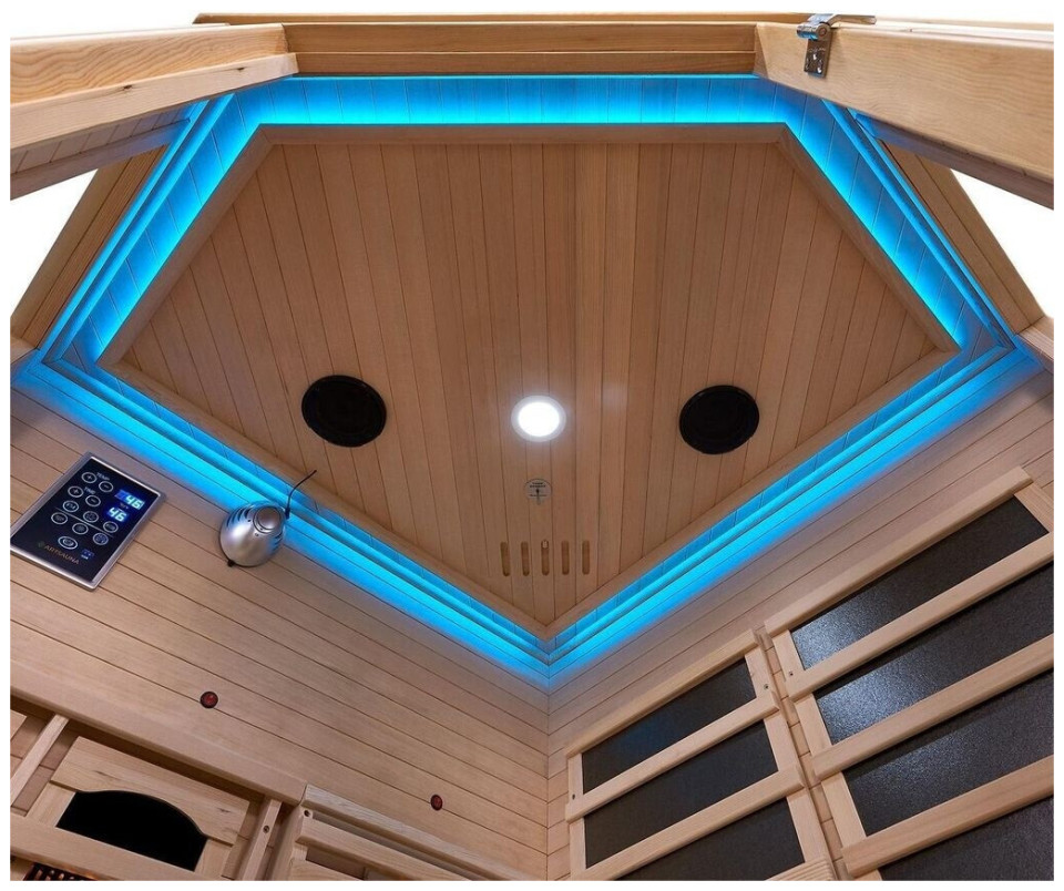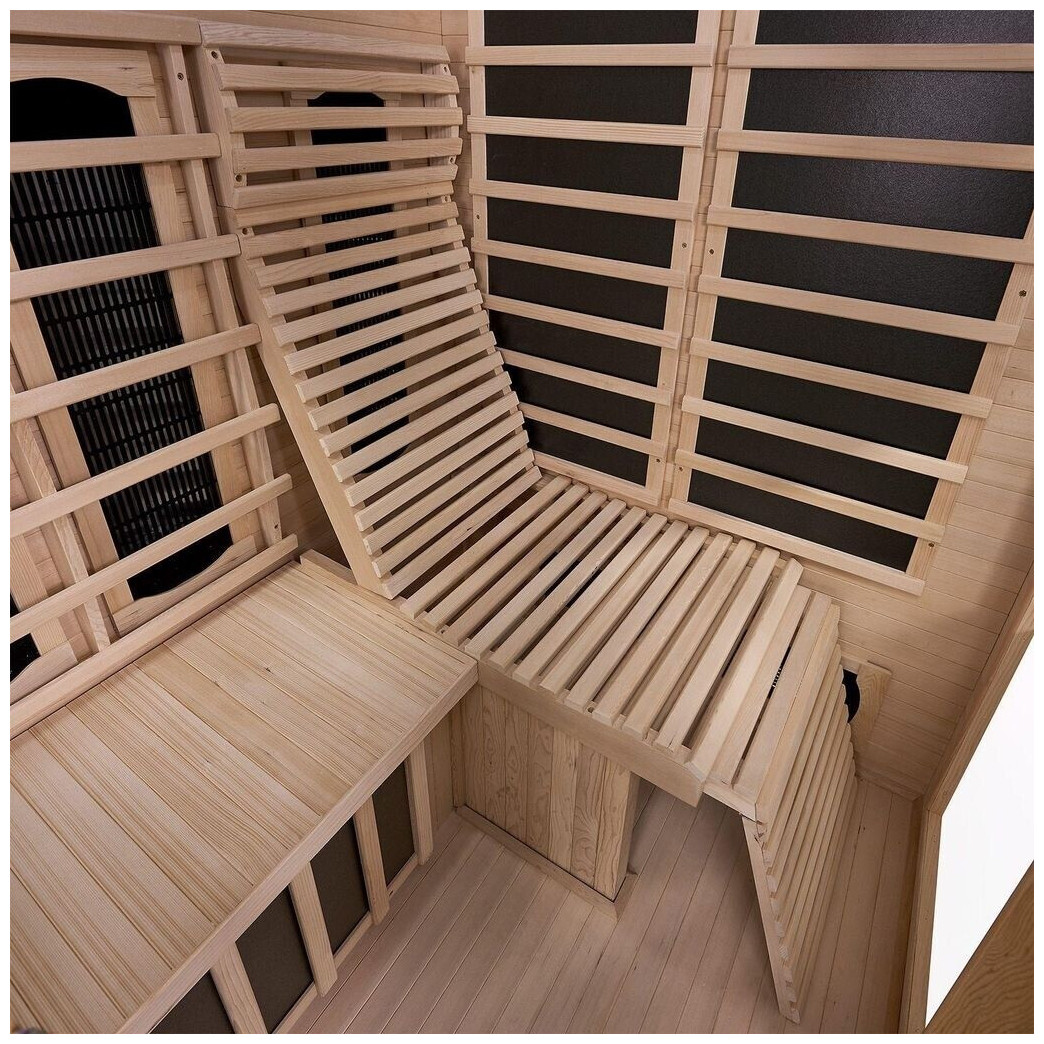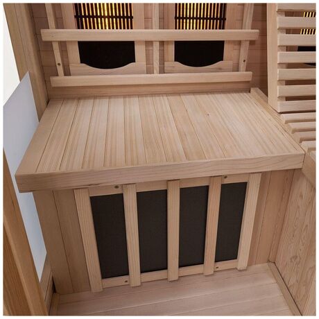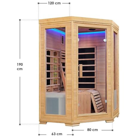 Η σάουνα διαθέτει 4 πλήρους φάσματος θερμαντικά σώματα και 3 επιφανειακά θερμαντικά σώματα, εξασφαλίζοντας ομοιόμορφη κατανομή θερμότητας. Η γυάλινη πόρτα από ασφαλές γυαλί προσφέρει μια μοντέρνα αίσθηση, ενώ η γωνιακή είσοδος διευκολύνει την πρόσβαση. Με φωτεινή ροή 180 lm και θερμοκρασία χρώματος 3000 K, η ατμόσφαιρα είναι πάντα ευχάριστη και χαλαρωτική. Η συναρμολόγηση απαιτείται, αλλά οι οδηγίες είναι απλές και κατανοητές.