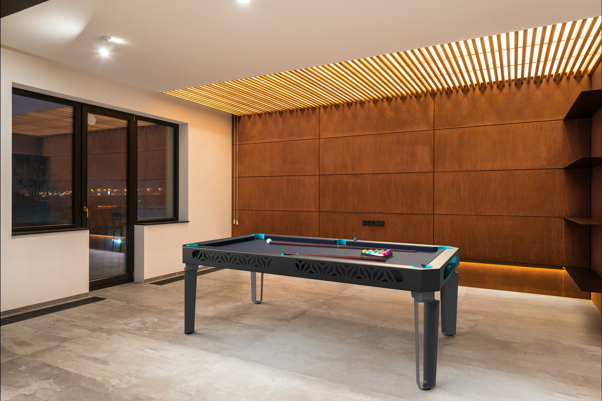 Τραπέζι μπιλιάρδου κατάλληλο για εξωτερικό χώρο από την Stag Iconic. To Model X ανήκει στην κατηγορία Premium και προορίζεται για ατέλειωτες στιγμές διασκέδασης με την παρέα σας. Η ποιότητα κατασκευής και τα υλικά που χρησιμοποιήθηκαν για να κατασκευαστεί αυτό το μπιλιάρδο είναι από τα κορυφαία! Το ύφασμα με το οποίο έχει επενδυθεί η επιφάνεια του τραπεζιού είναι ακρυλικό ειδικά κατασκευασμένο ώστε να αντέχει σε συνθήκες εξωτερικού περιβάλλοντος. Περιλαμβάνει στέκες, τρίγωνο, ρόμβος, κιμωλίες και ένα σετ μπαλών. Το τραπέζι έχει διαστάσεις 213x110cm ενώ η επιφάνεια του είναι ένας επαναστατικός συνδυασμός ξύλου και αλουμινίου. Το ξύλο είναι από μελαμίνη 4 χιλιοστών με αντοχή στις εξωτερικές συνθήκες και το αλουμίνιο είναι 8 χιλιοστά κυψελοειδούς δομής. Ο σκελετός είναι από γαλβανισμένο ατσάλι με επιστρώσεις για τη σκουριά, ενώ τα κοψίματα έχουν γίνει με laser cut. Τα πόδια ρυθμίζονται και μπορούν να διπλωθούν για να αποθηκεύσετε το τραπέζι, εύκολα, χωρίς να απαιτείται μεγάλος χώρος το μόνο που χρειάζεται να κάνετε εσείς είναι να ξεδιπλώσετε τα πόδια και είναι έτοιμο.