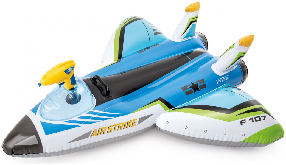 Φουσκωτό αεροπλανάκι με ενσωματωμένο νεροπίστολο από την εταιρία Intex με κωδικό 57536,ιδανικό για παιχνίδια στην πισίνα και την θάλασσα.Έχει δύο χερούλια βαριάς κατασκευής για να μπορείτε να το μεταφέρετε όπου επιθυμείτε!Το μέγιστο βάρος χρήστη είναι στα 40 κιλά και περιλαμβάνει και υλικά επιδιόρθωσης!