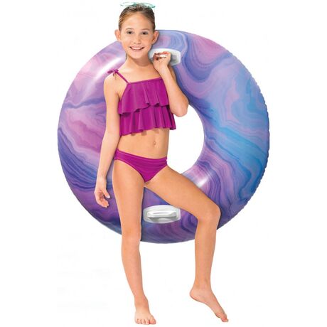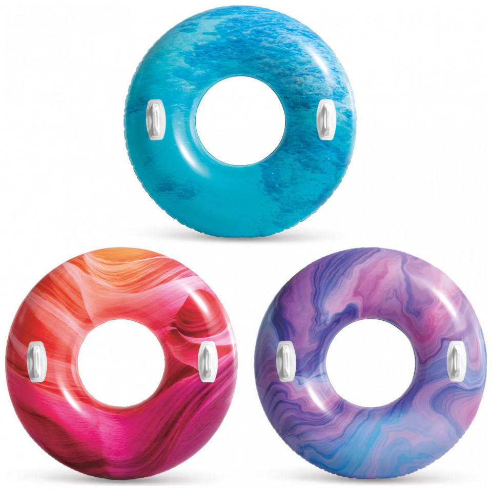 Φουσκωτή παιδική κουλούρα κολύμβησης της εταιρείας Intex από βινύλιο κατάλληλη για παιχνίδι στην παραλία ή στην πισίνα. Η εξωτερική της διάμετρος είναι 114 εκατοστά και προτείνεται για χρήση από παιδιά ηλικίας 9 ετών και άνω. Οι λαβές που ενσωματώνει επιτρέπουν στο παιδί να κρατιέται άνετα και με ασφάλεια κατά τη διάρκεια του παιχνιδιού. Επιπλέον, περιλαμβάνει kit επισκευής που επιτρέπει την επιδιόρθωση και την επαναχρησιμοποίηση της κουλούρας σε περίπτωση τρυπήματος.