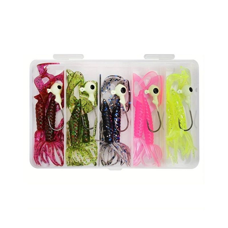 Σετ 10 δολώματα σιλικόνης διαφόρων χρωμάτων με 5 μολυβοκεφαλές σε πρακτική πλαστική κασετίνα.