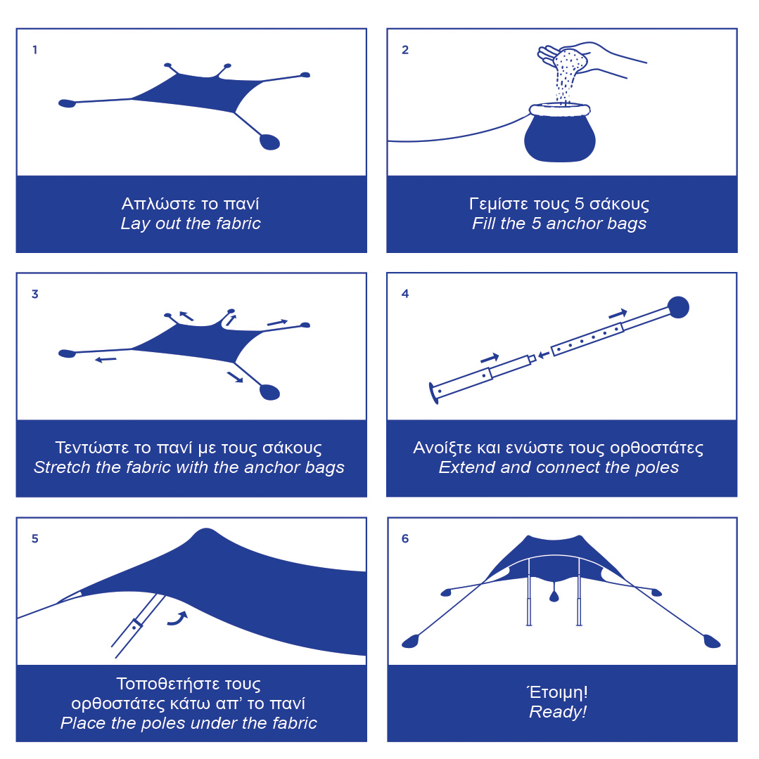 - Περιλαμβάνονται 4 σάκοι που γεμίζουν με άμμο ή βότσαλα για την σταθεροποίηση της τέντας