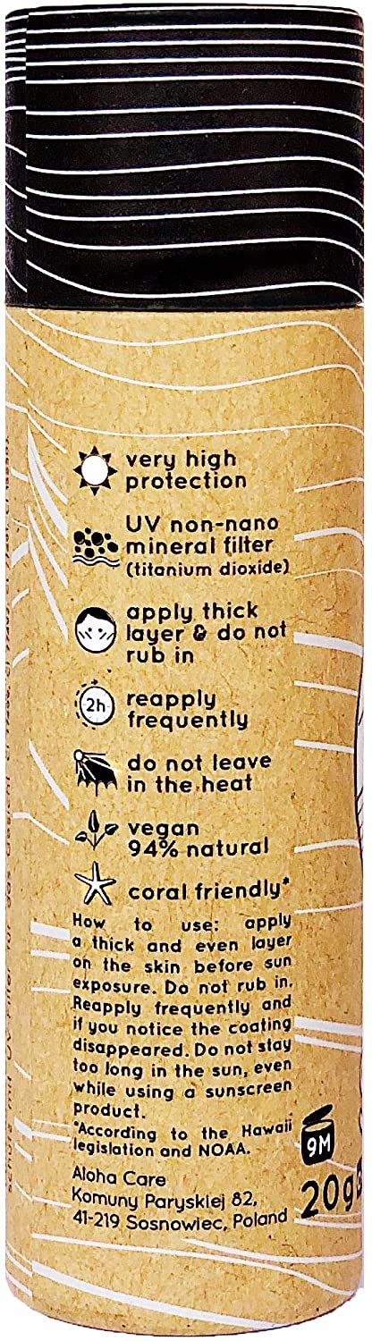 Αντηλιακό Aloha sun stick - ACAI BOWL - Μωβ Το νέο Aloha Sun Stick παρέχει υψηλή προστασία από τον ήλιο SPF 50+ για το πρόσωπό σας. Σχεδιασμένο με φυσικά συστατικά, σε φιλική προς το περιβάλλον συσκευασία, χωρίς πλαστικό 100% φιλικό προς το περιβάλλον. Διατίθεται σε 5 όμορφα χρώματα. Κατασκευάζεται σύμφωνα με τους περιοριστικούς κανονισμούς της ΕΕ. Γιατί να διαλέξει το Αντηλιακό Aloha sun stick; Σχεδιασμένο με φυσικά συστατικά και μόνο φίλτρα μη νανο-ανόργανων συστατικών! Σχεδιασμένο για surfers από surfers, σε φιλική προς το περιβάλλον συσκευασία μηδενικών απορριμμάτων. Ασφαλές για κοραλλιογενείς υφάλλους σύμφωνα με τη νομοθεσία της Χαβάης και την Υπηρεσία Εθνικού Ωκεανού της Αμερικής. SPF 50+ Mineral filters Πολύ υψηλή προστασία από την ακτινοβολία UVB και UVA. Το SPF αποδείχθηκε από το διαπιστευμένο εργαστήριο σύμφωνα με τον αυστηρό κανονισμό της ΕΕ. Το sun stick είναι ένα αντηλιακό που βασίζεται σε φίλτρο ορυκτών διοξείδιο του τιτανίου που δημιουργεί μια μεταλλική ασπίδα. Για την ασφάλειά σας, το προϊόν μας δεν περιέχει νανοσωματίδια. Eco-friendly, plastic-free paper tube Reef friendly Είναι κατασκευασμένο από πολλά στρώματα χαρτιού kraft, γεγονός που το καθιστά ανθεκτικό και δυνατό στη χρήση ακόμη και με βρεγμένα χέρια. Πιστοποιημένο FSC. Ο τύπος είναι μη τοξικός για τους υφάλους σύμφωνα με το νόμο της Χαβάης. Ψάχνουμε για αποτελεσματικά συστατικά που είναι ασφαλή για τη θάλασσα. Water resistant Vegan & 94% Natura Η αντηλιακή φόρμουλα επαληθεύεται στο εργαστήριο ως αδιάβροχη. Χάρη στα χρώματα μπορείτε να δείτε πόσο καιρό το επίστρωμα παραμένει στο πρόσωπό σας :) Το Aloha Sun Stick είναι σχεδιασμένο κυρίως με φυσικά συστατικά και δεν περιέχει συστατικά ζωικής προέλευσης Διαλέξτε το αγαπημένο σας χρώμα Sun Stick Μπορείτε να επιλέξετε ανάμεσα σε τρία παστέλ χρώματα, τα οποία σας βοηθούν να δείτε αν το αντηλιακό παραμένει εκεί (ή το έχει ξεβγάλει το νερό). Εκτός αυτού, κάνει την αντηλιακή προστασία διασκεδαστική! Surf Safe με χρώμα! SUNSET SESSIONS WAIKIKI WATERS BALI BEACH Το Pinky Sun-Shield σας προσφέρει 2 σε 1 - υψηλή προστασία και μια γοητευτική εμφάνιση κορίτσι-πολεμιστή! Το μακιγιάζ του Surfer! Εκτός από τις φυσικές χρωστικές, επιλέξαμε ένα συνθετικό, που χρησιμοποιείται ευρέως στα φυσικά καλλυντικά για να αποκτήσουμε όμορφο ροζ χρώμα! Η ΕΕ το εγκρίνει ως απολύτως ασφαλές για το δέρμα. Εκτός από την εξαιρετική προστασία από τον ήλιο κατά τη διάρκεια μεγάλων περιόδων στο νερό, αυτό το ανοιχτό μπλε χρώμα θα προσθέσει +10 βαθμούς στις ικανότητές σας στο σερφ. Γίνετε μέρος του ωκεανού. Μόνο ορυκτές χρωστικές μέσα! Ο μαυρισμένος τόνος του δέρματος - έχει το φυσικό χρώμα του δέρματος, οπότε δεν μοιάζετε με λευκός λαγός ενώ πιάνετε ένα κύμα. Ιδανικό για κάλυψη τατουάζ και πανάδων. Συνιστάται για το νερό αλλά και πέρα από αυτό. Μόνο ορυκτές χρωστικές μέσα! Τι υπάρχει μέσα στο Aloha Sun Stick; CASTOR SEED OIL Μαλακώνει και λειαίνει TITANIUM DIOXIDE (non-nano) UV Φίλτρο ορυκτών CANDELILLA WAX Απαλύνει, τρέφει CARNAUBA WAX Ομαλή εφαρμογή, γυαλιστερό φινίρισμα RASPBERRY SEED OIL Φυσικό φίλτρο UV, ενυδατώνει VITAMIN E Αντιοξειδωτικό Αντηλιακό με βάση UV φίλτρα ορυκτών Ασφαλές για το δέρμα - 94% φυσικά συστατικά Το Aloha Sun Stick είναι σχεδιασμένο κυρίως με φυσικά συστατικά, με βάση το φίλτρο ορυκτών διοξειδίου του τιτανίου και το οργανικό έλαιο σμέουρων. Το Aloha Sun Stick δεν περιέχει νανοσωματίδια, που η επίδρασή τους στο δέρμα δεν έχει ελεγχθεί διεξοδικά και έχει αναγνωριστεί ως επικίνδυνο για την κοραλλιογενή ύφαλο. Δεν υπάρχουν χημικά φίλτρα UV! 