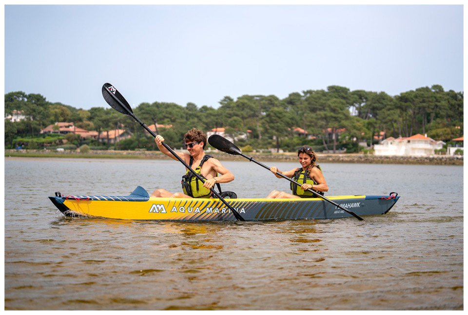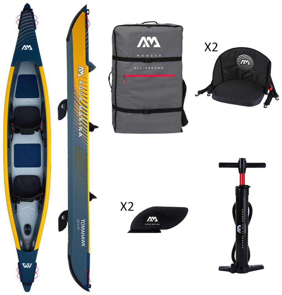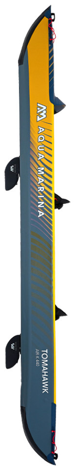 Φουσκωτό Κανοε Tomahawk II Air-K440 της Aqua Marina Σχεδιασμένο για θάλασσα με ήρεμα νερά, λίμνες και κανάλια. O εξαιρετικός συνδυασμός, σχεδιασμού κύτους και φουσκωτής καρίνας ,δίνει μεγάλη σταθερότητα και ταχύτητα στην κωπηλασία. Πλώρη σχεδιασμένη ώστε να απομακρύνει τα νερά κατά την πλεύση. Χειρολαβές μεταφοράς από καουτσούκ. 3 βαλβίδες αέρα για μεγαλύτερη ασφάλεια σε μεγάλες αποστάσεις. Κάθισμα με ψηλή πλάτη, αφρώδες μαξιλάρι και τσέπες για αποθήκευση αντικειμένων. Η Συσκευασία εκτός από το κανο περιλαμβάνει σακίδιο μεταφοράς με φερμουάρ, 2 καθίσματα ψηλής πλάτης με αφρώδες μαξιλάρι και τσέπες, 2 πτερύγια καγιάκ, αντλία αέρος διπλής ενέργειας Liquid Air V1.