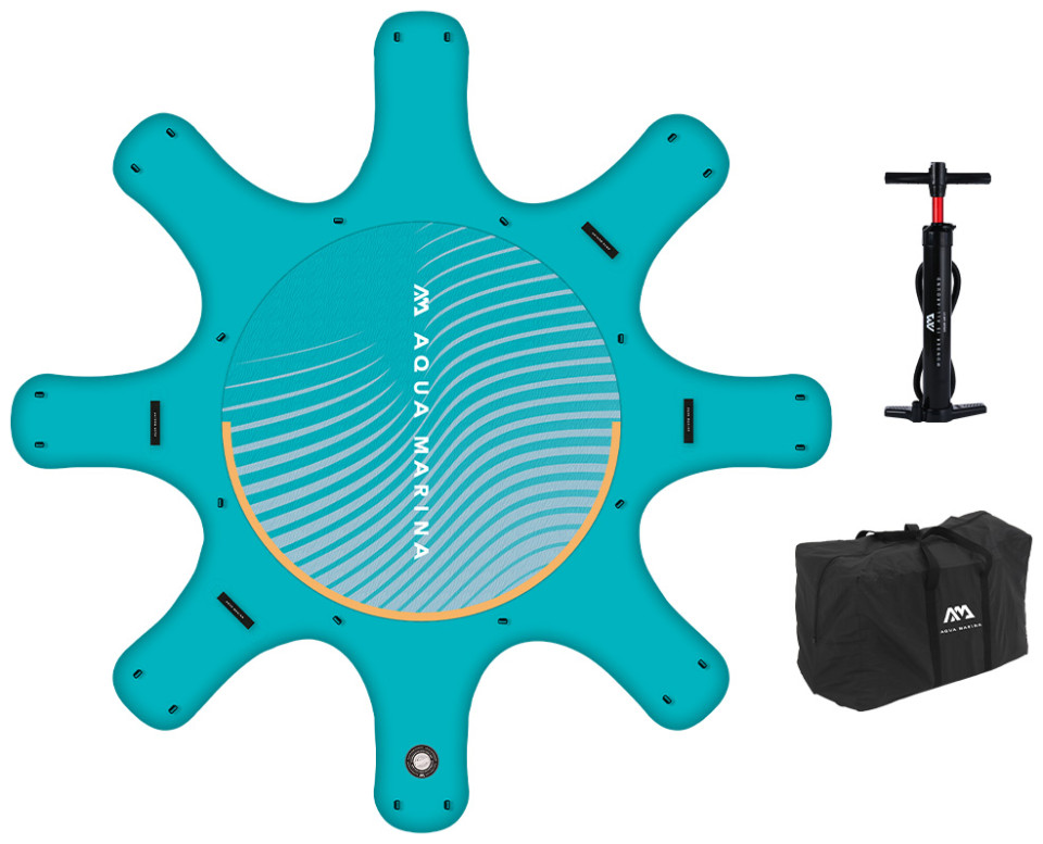 Φουσκωτή Πλατφόρμα Yoga Dock for Dhyana της Aqua Marina για εκπαιδευτή yoga, με δυνατότητα να δεχτεί 8 σανίδες περιμετρικά. Δίνει την δυνατότητα στις σανίδες να δεθούν σε 3 σημεία με την πλατφόρμα για μέγιστη σταθερότητα κατά την διάρκεια προπόνησης. Μεγάλη επιφάνεια από ανάγλυφο αντιολισθητικό υλικό EVA με υφή άμμου για ελευθερία στις κινήσεις. Η Συσκευασία περιλαμβάνει σάκο Μεταφοράς και μια αντλία αέρος διπλής ενέργειας.