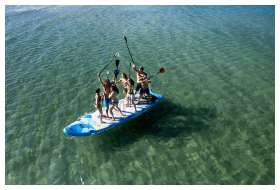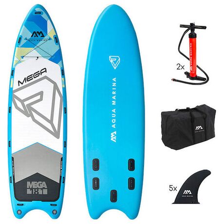 Ένα γιγάντιο Sup από την Aqua Marina κατάλληλο για καθέλκυση στη θάλασσα και στο ποτάμι, που έχει δοκιμαστεί από έμπειρους αναβάτες και έχει επιβεβαιωθεί ότι αντέχει ακόμη και στις πιο σκληρές συνθήκες! Η φουσκωτή σανίδα όρθιας κωπηλασίας Mega Group 18’1’’ αποτελεί εξαιρετική επιλογή, εάν θέλετε να περάσετε ανεπανάληπτες στιγμές διασκέδασης στο νερό μαζί με τους φίλους ή την οικογένειά σας! Χάρη στις μεγάλες διαστάσεις της 550 x 152 x 20 cm, αλλά και στο ωφέλιμο βάρος έως 650 κιλά, σας παρέχει τη δυνατότητα να κωπηλατείτε μαζί με μεγάλη παρέα έως έξι ατόμων. Για να καθίσταται εξαιρετικά ανθεκτική αλλά και σταθερή, διαθέτει άκαμπτη κατασκευή και σύστημα 5 πτερυγίων στο κεντρικό της τμήμα, ενώ για να σας προσφέρει εξαιρετική εργονομία μπορεί να ξεφουσκώνει και να τυλίγεται πολύ εύκολα και γρήγορα, ώστε να την αποθηκεύετε με μεγάλη άνεση! Παράλληλα χάρη στις πολλαπλές της χειρολαβές, σας διευκολύνει στη μεταφορά της, ώστε να την κουβαλάτε με άνεση και ευκολία κατά τις εξορμήσεις σας. Το προϊόν συνοδεύεται, εκτός από τα 5 κεντρικά πτερύγια και τις χειρολαβές, από αντάπτορα βαλβίδας, αντλία αέρος χειρός και βάση για την προσάρτηση action κάμερας σε περίπτωση που θέλετε να καταγράφετε τις περιπέτειές σας στο υγρό στοιχείο. Επιπλέον, μαζί με τη σανίδα διατίθεται και πρακτικό σακίδιο πλάτης για να μπορείτε να μεταφέρετε με ευκολία και άνεση όλο τον απαραίτητο εξοπλισμό της αγαπημένης σας δραστηριότητας! Πρόκειται για μια ανθεκτική επιλογή, ειδικά σχεδιασμένη για να σας παρέχει μοναδικές στιγμές περιπέτειας και διασκέδασης με τους φίλους σας στο νερό!
