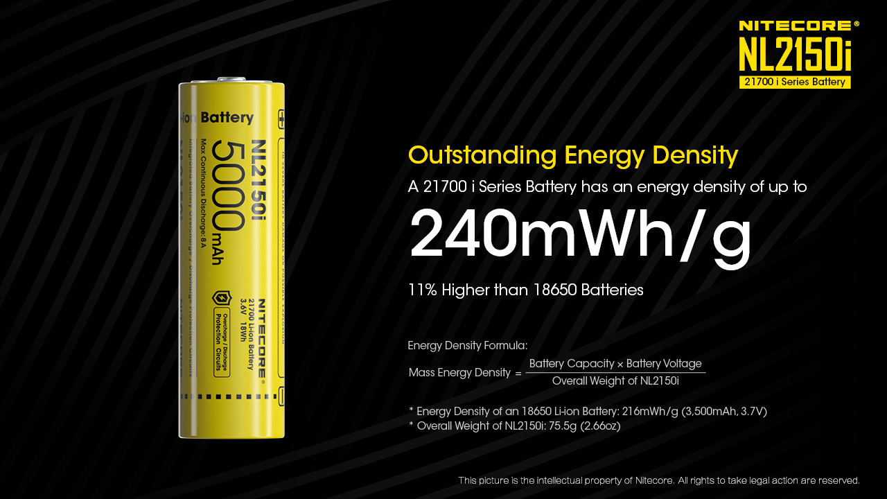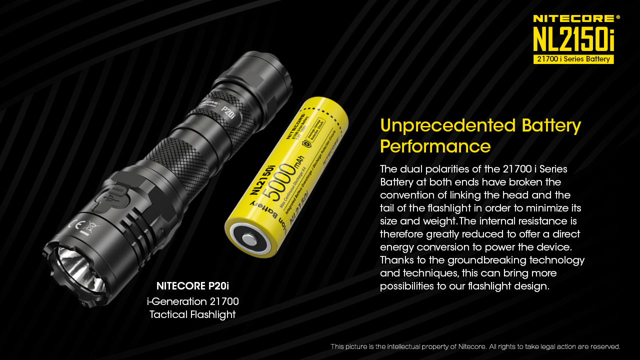 Επαναφορτιζόμενη μπαταρία 21700 της σειράς " i " με χωρητικότητα 5000mAh και ρεύμα αποφόρτισης 8Α.Η σειρά " I " των μπαταριών 21700 αποτελεί μία επαναστατική και Πανίσχυρη αναβάθμιση (Ευρεσιτεχνία Νο. ZL201820118916.0, US Patent pending)Οι μπαταρίες 21700i είναι ένα προϊόν ευρεσιτεχνίας που αναπτύχθηκε από την NITECORE επιτρέπουν την υψηλής απόδοσης παροχή ρεύματος μειώνοντας τις απώλειες από την εσωτερική αντίσταση.Διαθέτει σε κάθε της πλευρά και θετικό και αρνητικό πόλο, καθώς και υψηλή συγκέντρωση ενέργειας.Είναι συμβατή με προσαρμοζόμενα αξεσουάρ έξυπνων συστημάτων επικοινωνίας και ελέγχου.Οι μπαταρίες 21700i διαθέτουν ενεργειακή πυκνότητα που φθάνει έως και 240mWh/g 11% περισσότερο από τις μπαταρίες 18650.Η απόδοση της μπαταρίας δεν έχει προηγούμενο:η διπλή πολικότητα και στις δύο πλευρές των μπαταριών της σειράς 21700i έσπασε τον κανόνα της