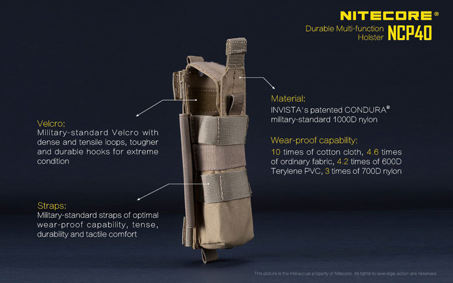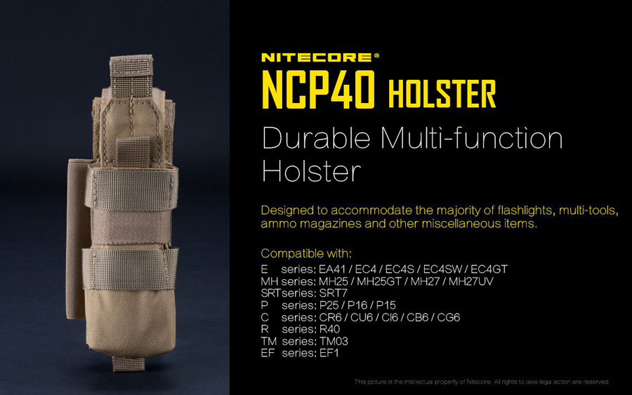 Επιχειρησιακή θήκη από 1000άρα cordura για μέγιστη αντοχή. Είναι σχεδιασμένη να δέχεται τους περισσότερους φακούς, πολυεργαλεία, γεμιστήρες πιστολίων και διάφορα άλλα αντικείμενα.Η θήκη NCP40 μπορεί πολύ εύκολα και γρήγορα να προσαρμοστεί σε οποιοδήποτε σύστημα Molle. Διαθέτει σύστημα γρήγορης αφαίρεσης του καλύμματος. Το καπάκι μπορεί να διπλωθεί για ταχύτητα στο τράβηγμα. Ελαστικοί ιμάντες ασφαλίζουν τα προϊόντα στην θέση τους. Διαθέτει ειδική θέση για επιχειρησιακό στυλό. Διατίθεται σε δύο χρωματισμούς: Μαύρο και Χακί (Tan).