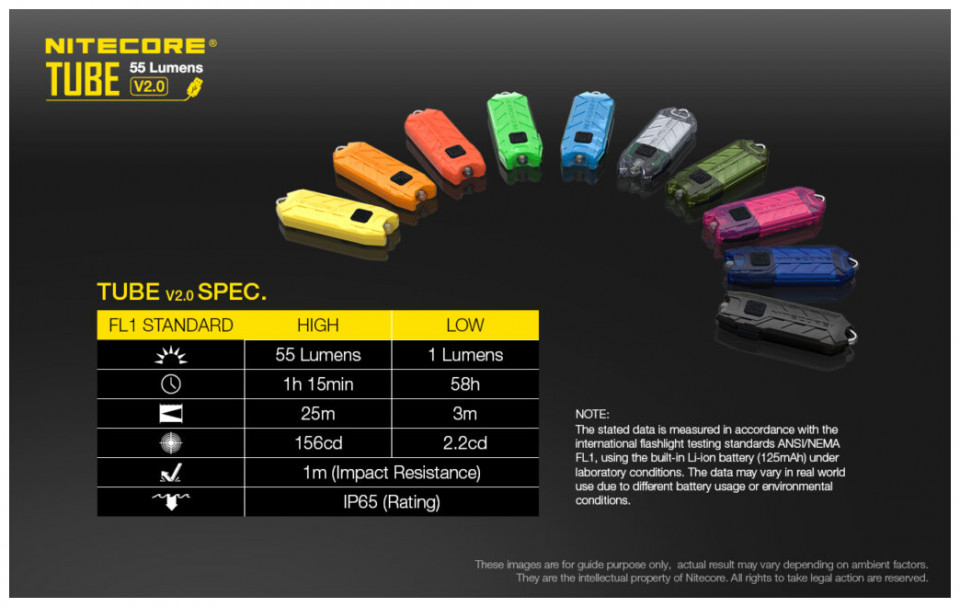 Ο εξαιρετικά ελαφρύς και ανθεκτικός φακός- μπρελόκ Led Nitecore Tube διαθέτει μέγιστη απόδοση έως και 55 Lumens, ενώ η απόσταση εκπομπής της δέσμης του μπορεί να καλύψει μέχρι και 25 μέτρα. Η εξαιρετικά ευρεία δέσμη εκπομπής 100° προσφέρει άψογη περιφερειακή όραση. Έχει τη δυνατότητα επιλογής μεταξύ δύο επιπέδων φωτεινότητας προσβάσιμα μέσω ενός διακόπτη για εύκολη χρήση με το ένα μόνο χέρι! Λειτουργεί με ενσωματωμένη επαναφορτιζόμενη μπαταρία Li-ion υψηλής απόδοσης, η οποία μπορεί να προσφέρει λειτουργία έως και 58 ώρες στην χαμηλή λειτουργία. Η φόρτισή του μπορεί να γίνει με ένα Το προϊόν είναι αδιάβροχο σύμφωνα με την πιστοποίηση IP65. Χάρη στον στιβαρό σχεδιασμό του αντέχει πτώσεις από έως και 1.5 μέτρα ύψος, ενώ το διπλό μεταλλικό δαχτυλίδι, από το οποίο συνοδεύεται, μπορεί να αντέξει μέχρι και 35 κιλά.