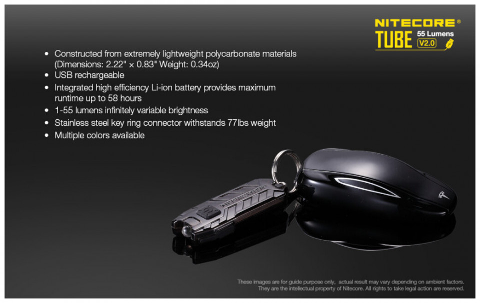 Ο εξαιρετικά ελαφρύς και ανθεκτικός φακός- μπρελόκ Led Nitecore Tube διαθέτει μέγιστη απόδοση έως και 55 Lumens, ενώ η απόσταση εκπομπής της δέσμης του μπορεί να καλύψει μέχρι και 25 μέτρα. Η εξαιρετικά ευρεία δέσμη εκπομπής 100° προσφέρει άψογη περιφερειακή όραση. Έχει τη δυνατότητα επιλογής μεταξύ δύο επιπέδων φωτεινότητας προσβάσιμα μέσω ενός διακόπτη για εύκολη χρήση με το ένα μόνο χέρι! Λειτουργεί με ενσωματωμένη επαναφορτιζόμενη μπαταρία Li-ion υψηλής απόδοσης, η οποία μπορεί να προσφέρει λειτουργία έως και 58 ώρες στην χαμηλή λειτουργία. Η φόρτισή του μπορεί να γίνει με ένα Το προϊόν είναι αδιάβροχο σύμφωνα με την πιστοποίηση IP65. Χάρη στον στιβαρό σχεδιασμό του αντέχει πτώσεις από έως και 1.5 μέτρα ύψος, ενώ το διπλό μεταλλικό δαχτυλίδι, από το οποίο συνοδεύεται, μπορεί να αντέξει μέχρι και 35 κιλά.