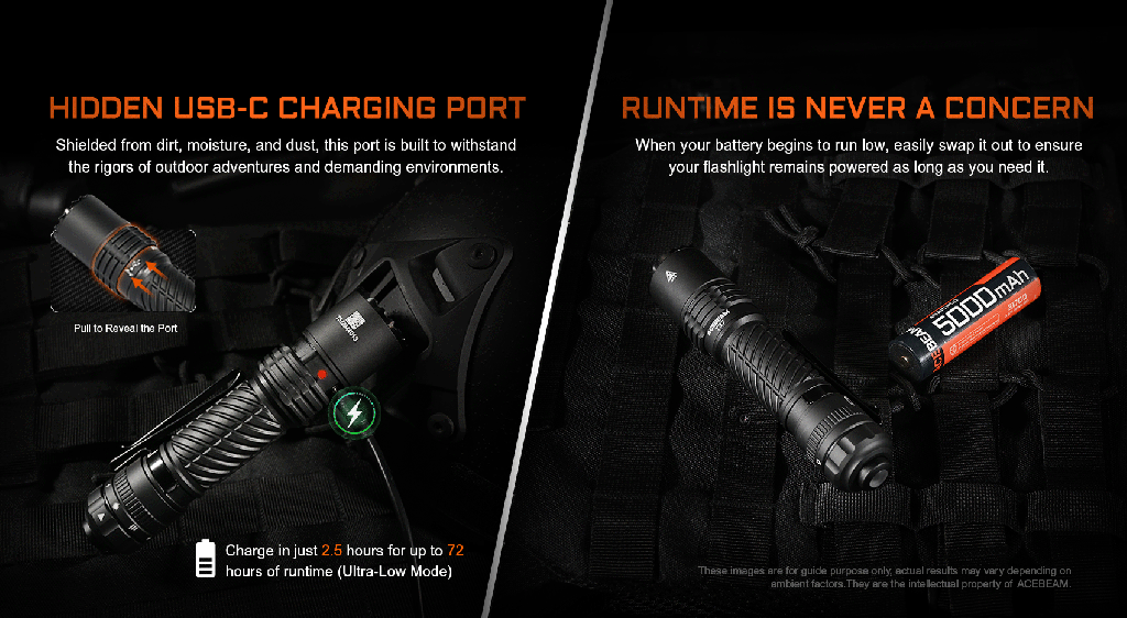 Ο φακός διαθέτει θύρα USB-C για γρήγορη φόρτιση, επιτρέποντας την πλήρη επαναφόρτιση της μπαταρίας 21700 σε μόλις 2,5 ώρες, με χρόνο λειτουργίας έως και 72 ώρες στη λειτουργία Ultra Low.