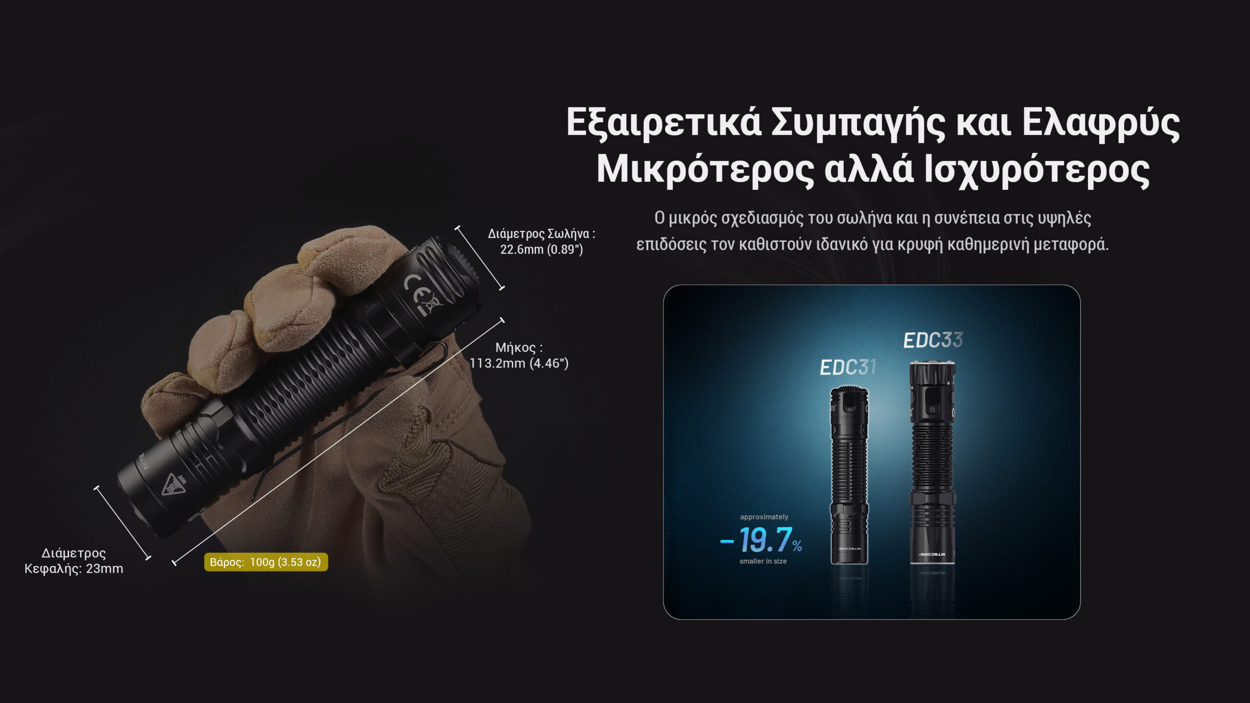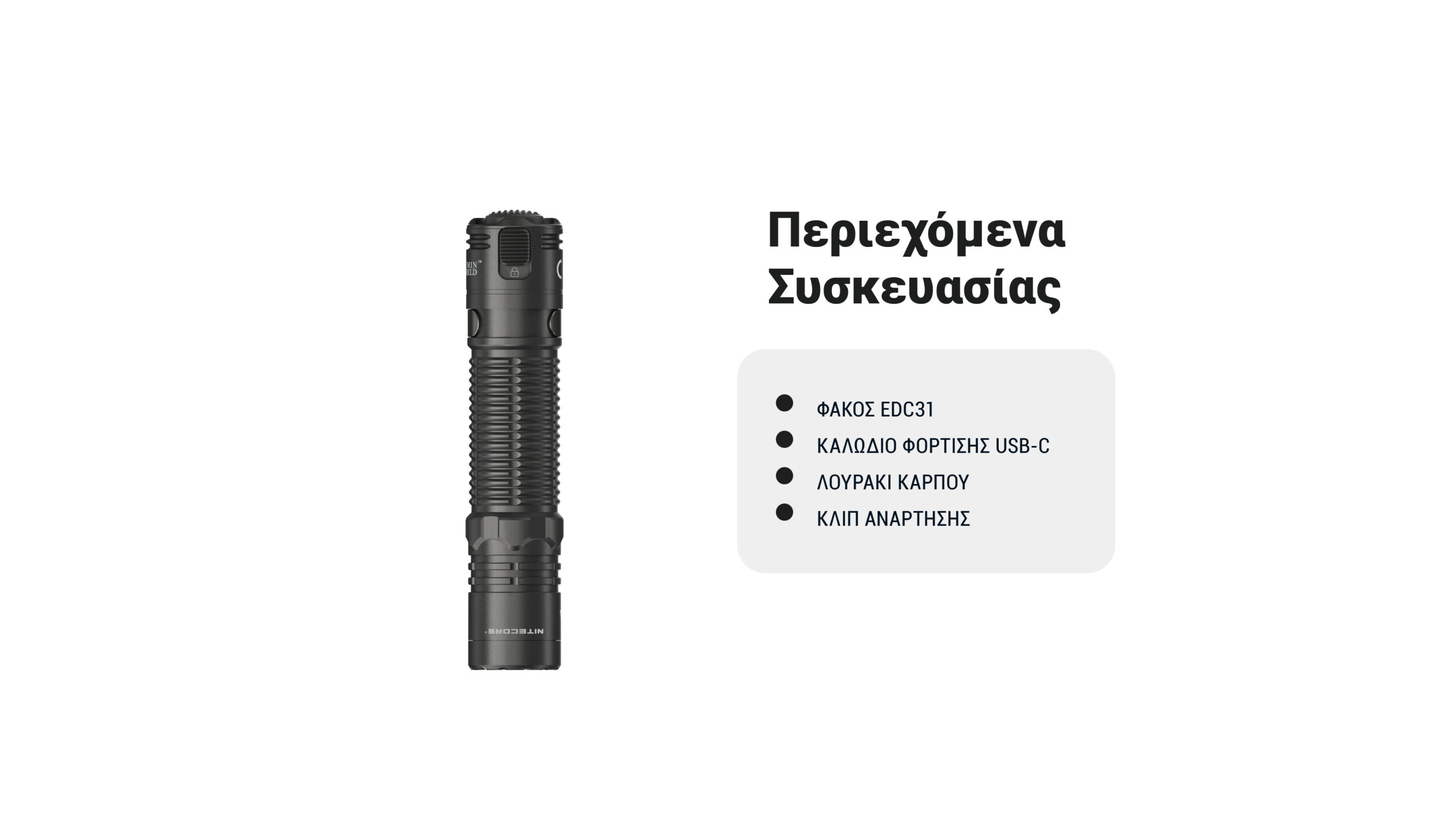 Ο Φάκος Led UHi LED Nitecore 3500 Lumens είναι ο ιδανικός σύντροφος για κάθε περιπέτεια σας. Με μέγιστη ισχύ δέσμης 3500 Lumens, προσφέρει εξαιρετική φωτεινότητα που καλύπτει τις ανάγκες σας σε οποιοδήποτε περιβάλλον. Η διάρκεια λειτουργίας του φτάνει τις 57 ώρες, εξασφαλίζοντας ότι θα έχετε πάντα φως όταν το χρειάζεστε. Ο φακός διαθέτει ενσωματωμένη μπαταρία 3,800mAh 18650 Li-ion, που τον καθιστά επαναφορτιζόμενο και βολικό στη χρήση. Με διάμετρο κεφαλής 23 mm και βάρος μόλις 100 γραμμάρια, είναι ελαφρύς και εύκολος στη μεταφορά. Ιδανικός για Gear, Law Enforcement, Outdoor/Camping και EDC, ο Nitecore EDC31 είναι εξοπλισμένος με ειδικές λειτουργίες όπως το LUMIN SHIELD, που προσφέρει επιπλέον προστασία και απόδοση.