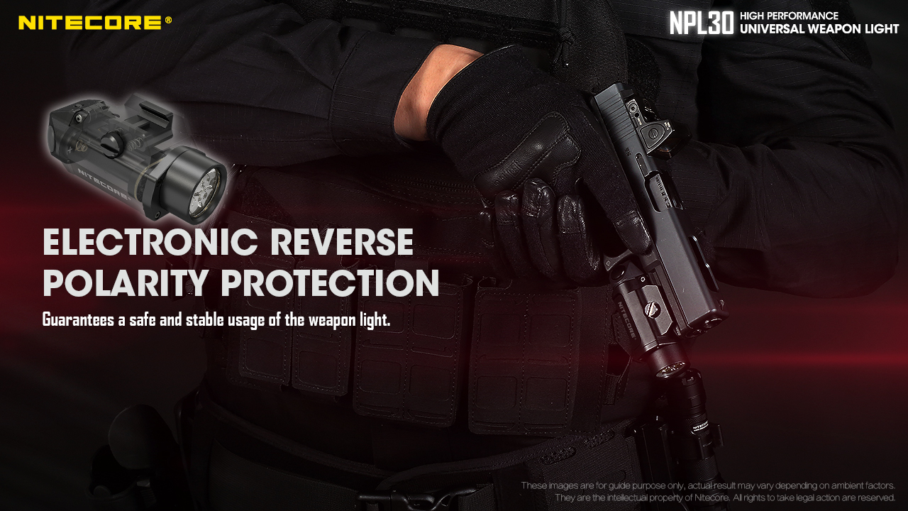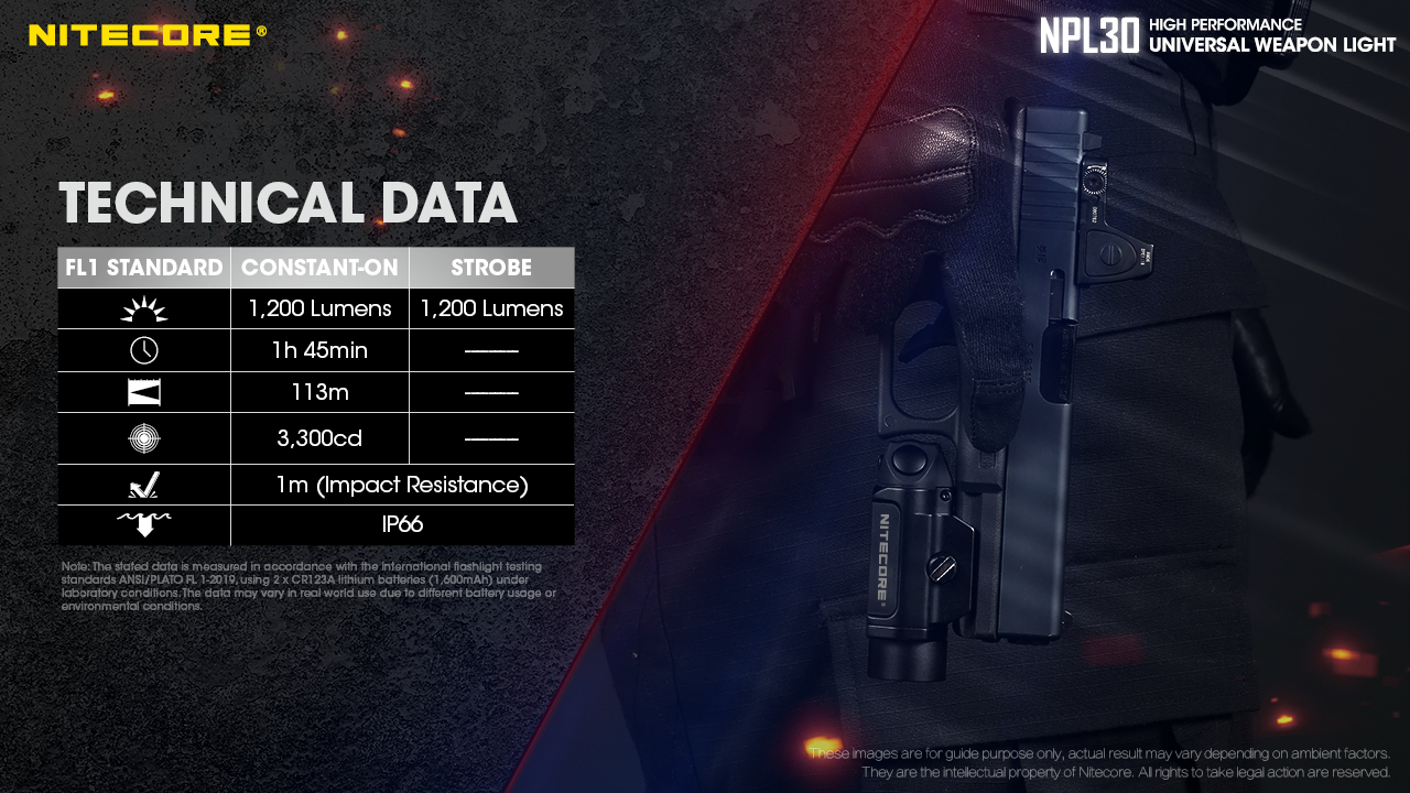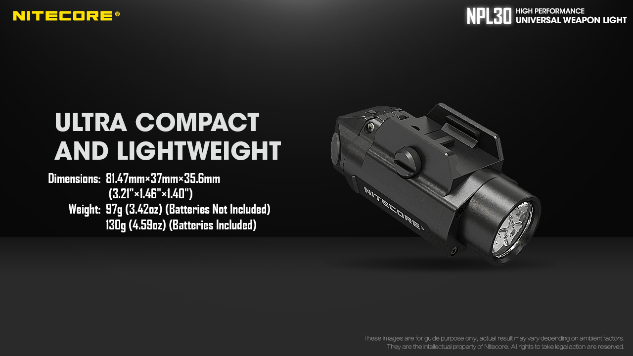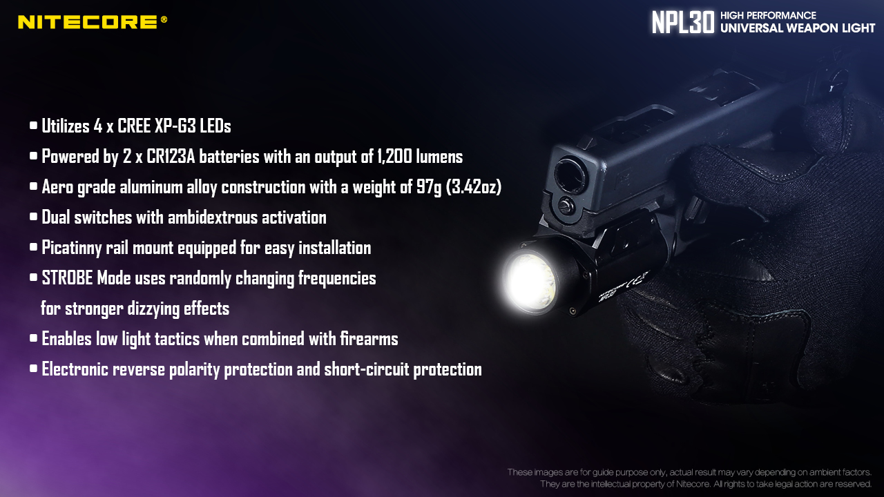 Φακός Όπλου Led Nitecore NPL30 με τροφοδοσία από δύο μπαταρίες CR123 οι οποίες περιλαμβάνονται στην συσκευασία. Είναι εφοδιασμένος με ένα LED CREE XP-G3 S3 που είναι ικανό να αποδώσει ένταση δέσμης που φθάνει τα 1440 κεριά, ιδανικός για επιχειρησιακή χρήση σε περιβάλλον χαμηλού φωτισμού. Διαθέτει ένα διακόπτη αμφιδέξιο για την ενεργοποίηση και την επιλογή λειτουργίας. Οι δυο διακόπτες έχουν την ίδια λειτουργία και παρέχει την δυνατότητα να επιλέξετε ανάμεσα σε 3 διαφορετικούς τύπους φωτισμού. Τον επιχειρησιακό στιγμιαίο φωτισμό, πιέζοντας και κρατώντας πατημένο οποιονδήποτε από τους δυο διακόπτες. Τον μόνιμο φωτισμό, πιέζοντας σύντομα οποιονδήποτε από τους δυο διακόπτες. Τέλος των φωτισμό Strobe, πιέζοντας 3 φορές σύντομα οποιονδήποτε από τους δυο διακόπτες, είτε ο φακός είναι ενεργοποιημένος είτε απενεργοποιημένος. Τροφοδοτείται από δύπ μπαταρίες CR123 και μπορεί να λειτουργήσει έως και 50 λεπτά. Με δυνατότητα προσαρμογής σε ράγες Picantinny, είναι σχεδιασμένο για γρήγορη προσαρμογή και αφαίρεση ανα πάσα στιγμή. Η ενσωματωμένη μονάδα εξελιγμένης ρύθμισης της θερμοκρασίας (ATR) ρυθμίζει την ένταση φωτισμού σύμφωνα με τις συνθήκες λειτουργίας και το γύρω περιβάλλον ώστε να διατηρείται η βέλτιστη απόδοση. Ο μηχανισμός του είναι σχεδιασμένος για αντοχή σε κρούσεις και διαθέτει προστασία ανάποδης πολικότητας (Ευρεσιτεχνία Νο.ZL201220677948.7). Βαθμολογημένος με IP67 για την αδιαβροχοποίηση και αντοχή σε πτώσεις έως και από 1 μέτρο. Ικανός να χρησιμοποιηθεί σε κάθε είδους περιβάλλον.