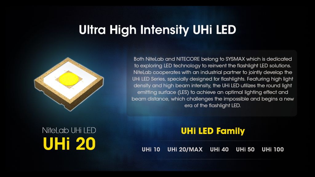 Η NiteLab συνεργάζεται με έναν βιομηχανικό εταίρο για την από κοινού ανάπτυξη των UHi LED Series, ειδικά σχεδιασμένων για φακούς. Διαθέτοντας υψηλή φωτεινότητα πυκνότητα και υψηλή ένταση δέσμης, η UHi LED χρησιμοποιεί το στρογγυλό φως επιφάνεια εκπομπής φωτός (LES) για την επίτευξη βέλτιστου αποτελέσματος φωτισμού και απόσταση δέσμης, η οποία προκαλεί το αδύνατο και ξεκινά μια νέα εποχή των LED για τους φακούς.