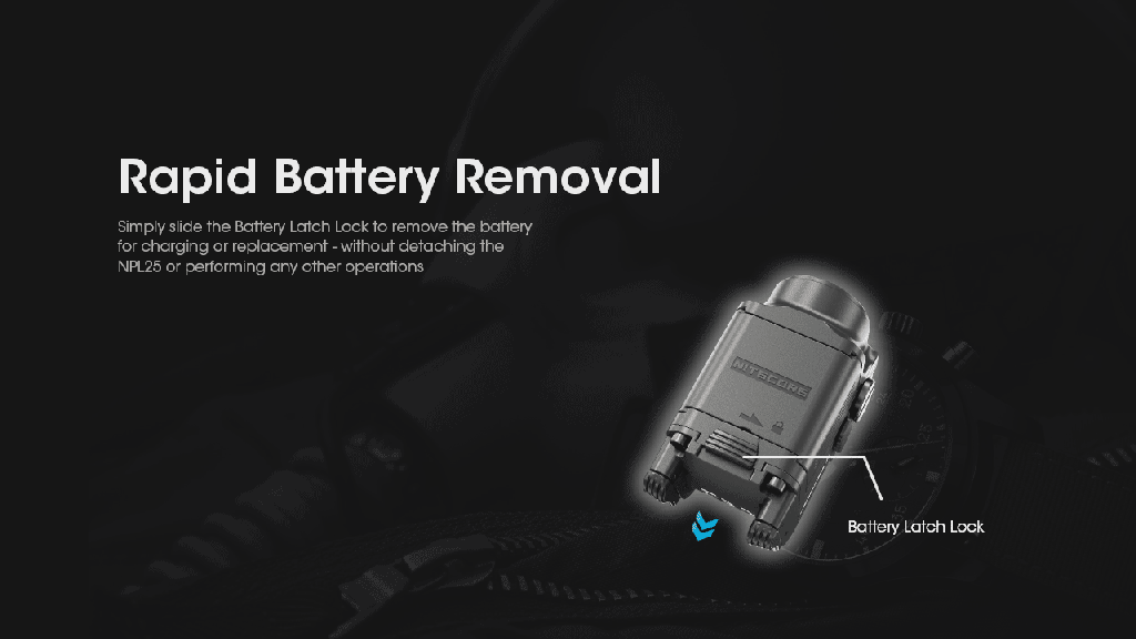 Απλά σύρετε τον μοχλό ασφάλισης της μπαταρίας για να αφαιρέσετε τη μπαταρία ώστε να την φορτίσετε ή να την αντικαταστήσετε χωρίς να αποσυνδέσετε τον φακό από το όπλο ή να κάνετε οποιαδήποτε άλλη ενέργεια.