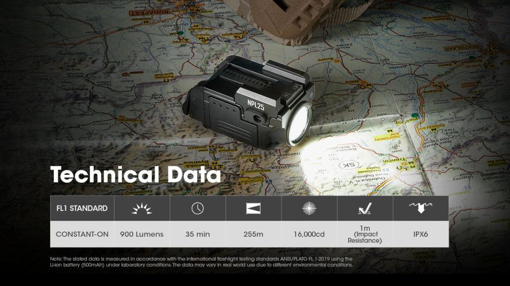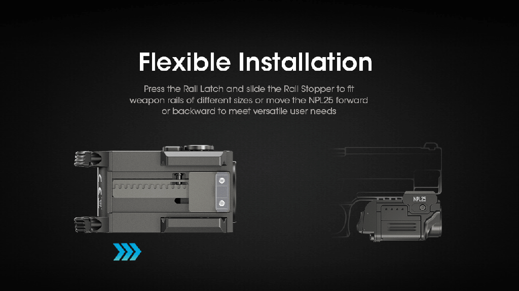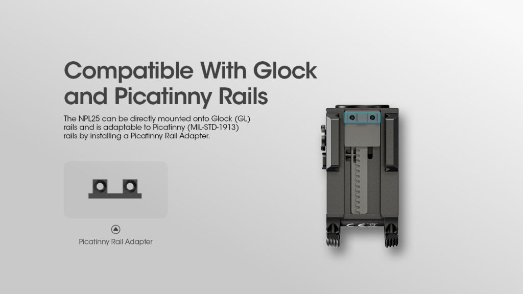 Ο φακός NITECORE NPL25 μπορεί να τοποθετηθεί άμεσα στην ράγα από ένα πιστόλι Glock και μπορεί να προσαρμοστεί και σε ράγα Picatinny (MIL-STD-1913) τοποθετώντας έναν αντάπτορα για τις ράγες αυτές.