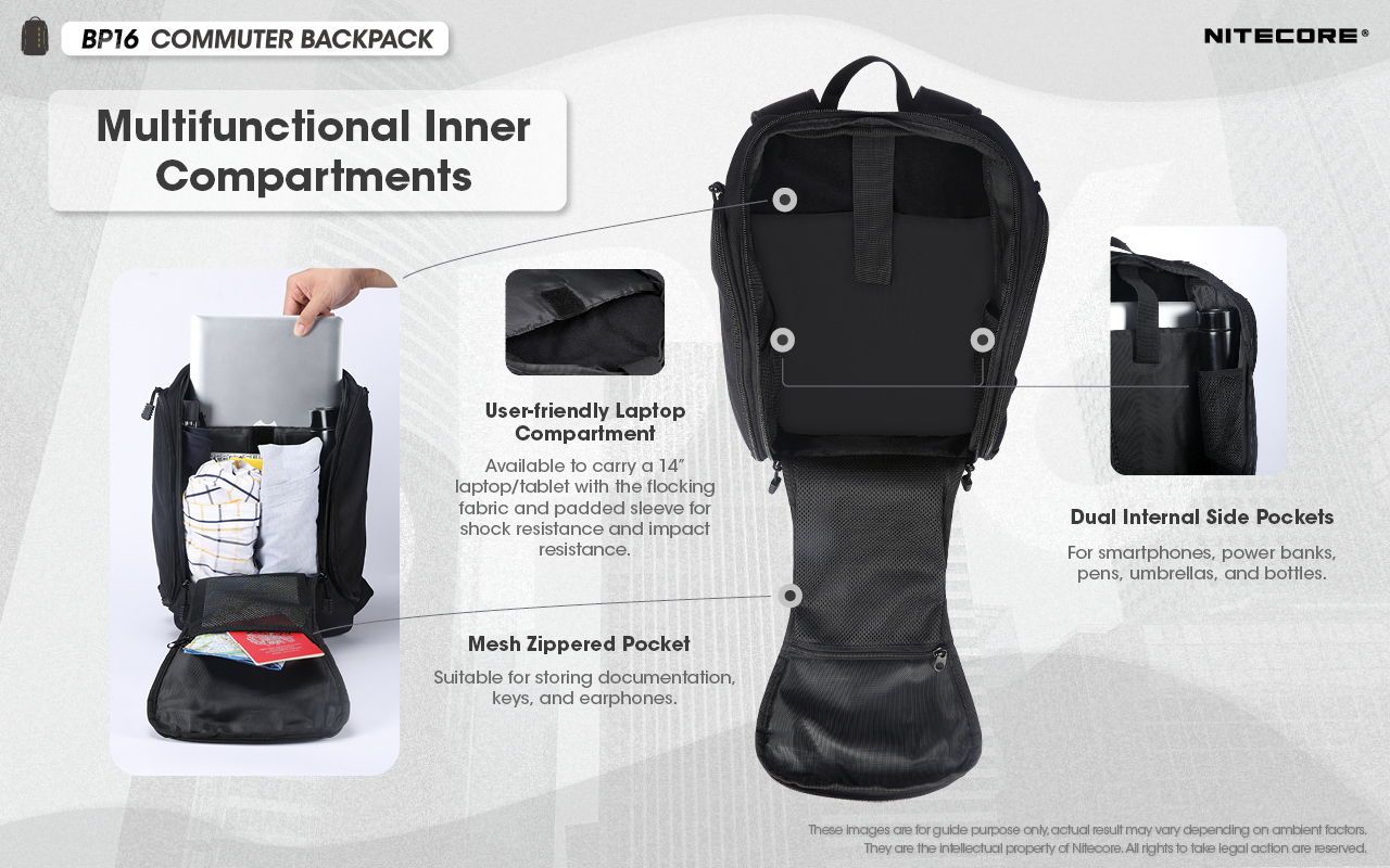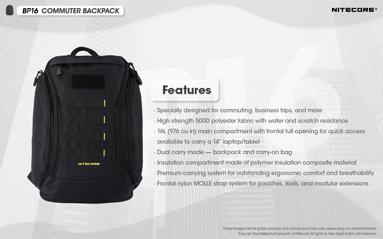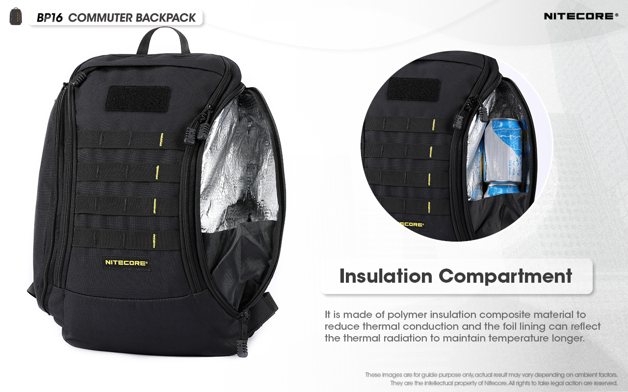 Σακίδιο Πλάτης Δραστηριοτήτων 16L της Nitecore με σχεδιασμό πλήρους ανοίγματος για γρήγορη πρόσβαση και οργάνωση των αντικειμένων που είναι απαραίτητα στις καθημερινές μετακινήσεις και τα επαγγελματικά ταξίδια. Φιλικό προς τον χρήστη διαμέρισμα για το Laptop, ικανό να χωρέσει Laptop ή Tablet μέχρι 14″ με ιμάντα ασφάλισης και μαλακή επένδυση στην θήκη για προστασία από κραδασμούς και χτυπήματα. Είναι κατασκευασμένο από πολυμερικό μονωτικό υλικό ώστε να μειώνεται η θερμική αγωγιμότητα και η επένδυση αλουμινίου μπορεί να αντανακλά τη θερμική ακτινοβολία ώστε να διατηρείται η θερμοκρασία περισσότερο. Μπροστινή θήκη με κρυφό φερμουάρ για την αποθήκευση προσωπικών αντικειμένων όπως κινητά τηλέφωνα και γυαλιά. Εφοδιασμένο με φαρδύς σε σχήμα S ιμάντες, γεμισμένους με μαλακή επένδυση ώστε να μειώνουν την πίεση στους ώμους και παράλληλα να προσφέρουν άνεση και καλό αερισμό στις πολύωρες μετακινήσεις.