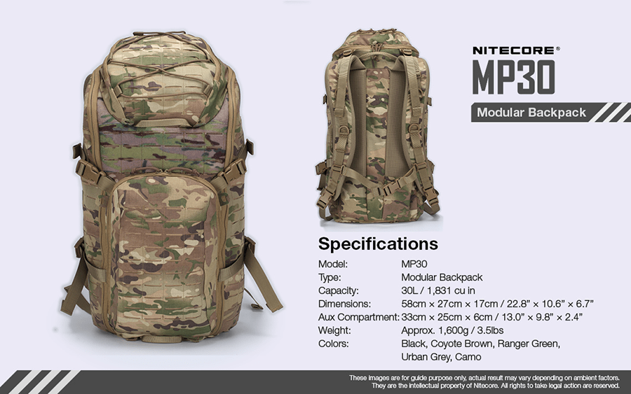 Σακίδιο πλάτης Nitecore χωρητικότητας 30 λίτρων με εσωτερικό σχεδιασμό που συνδυάζει επιφάνειες με βρόγχους και επιφάνειες με σύστημα ανάρτησης MOLLE.Είναι σχεδιασμένη για επιχειρήσεις μεγάλων αποστάσεων και μεγάλης διάρκειας,κατασκευασμένη από συνθετικό ύφασμα Nylon 500D ανθεκτικό στις τριβές και με αντίσταση στο νερό.Διαθέτει καινοτόμο σχεδιασμό για τη στήριξη από το καλάμι του υδροδοχείου και στις δύο πλευρές του σακιδίου.