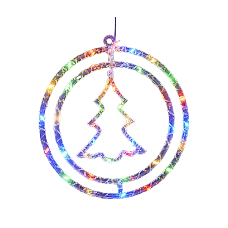 Χριστουγεννιάτικο φωτεινό διακοσμητικό 3D LED με διαφανείς κρίκους και σχέδιο έλατο. Ένα μοναδικό πολύχρωμο διακοσμητικό που αντανακλά στη διαφάνεια και δημιουργεί ένα εντυπωσιακό εφέ, για να δώσετε χρώμα στον στολισμό σας! Ιδανική επιλογή για να εντυπωσιάσετε τους μικρούς μας φίλους!